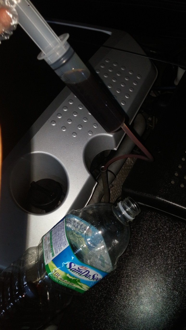 저 튜브를 엔진오일 딥 스틱을 빼 내고 그 자리에 주욱 밀어 넣는다. 밀어 넣다가 더 이상 안 들어가면 다시 한번 더 밀어 넣어 줘서 엔진 바닥에 튜브 끝단이 닿도록 해 준다. 그리고 주사기 플런저를 잡아당기면 어렵지 않게 엔진오일이 주사기로 빨려온다. 주행 후에는 엔진오일이 뜨겁고 점도가 더 묽어져 있는 상태라 뽑아내기가 더 수월하다.