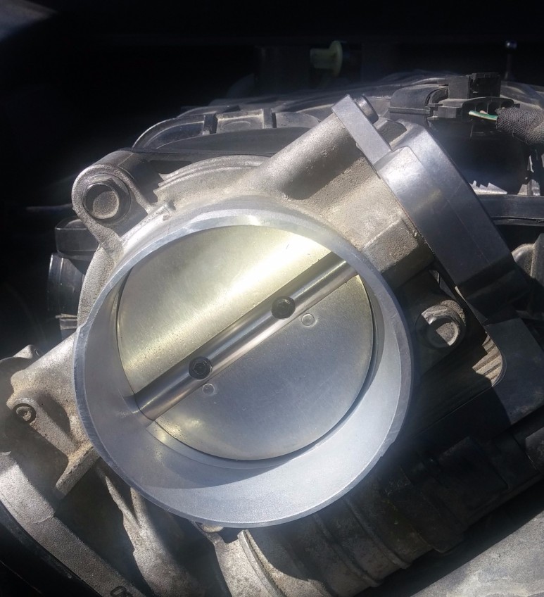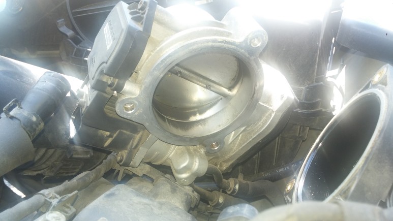 세척 후 깨끗해진 스로틀 바디 전면부. 뒤쪽 역시 깨끗하게 청소함