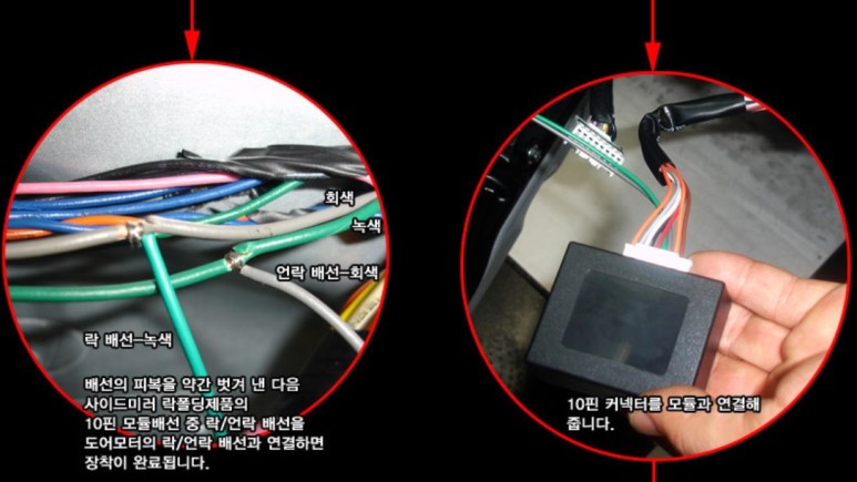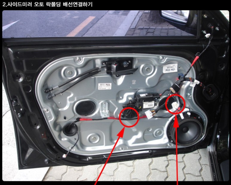 이게 무슨 사서 고생인지... 아방이는 운전석 도어 스위치 패널에 있는 사이드 미러 폴딩/언폴딩 스위치로만 사이드 미러를 접었다 펼 수 있는걸 락폴딩을 달아서 리모컨으로도 미러 폴딩/언폴딩이 되도록 해 주는 작업임.