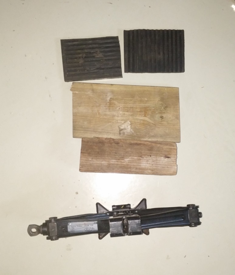 미미 고정 볼트를 풀기 전에 차량 하부에 기어 들어가 미션 오일 팬 하부를 작키로 받친다. 사다리 작키와 각목, 그리고 고무판 이용. 엔진 미미 교체할 때와 동일한 구성.