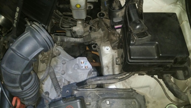 째려봐도 미션 미미는 안 보인다. 에어 클리너 박스 밑에 자리 잡고 있기 때문이다.