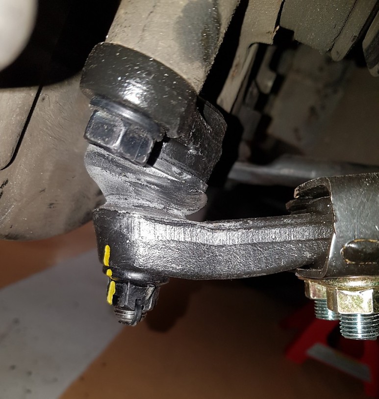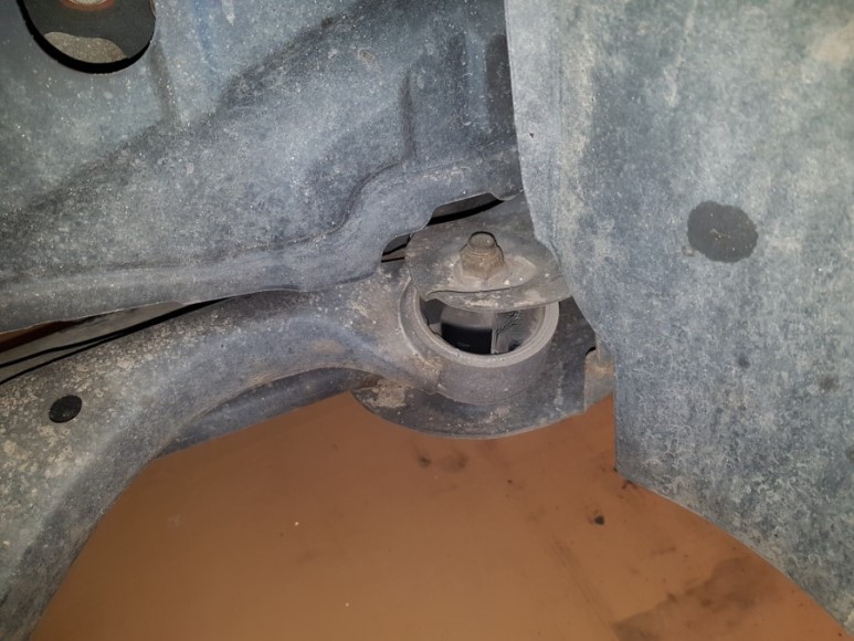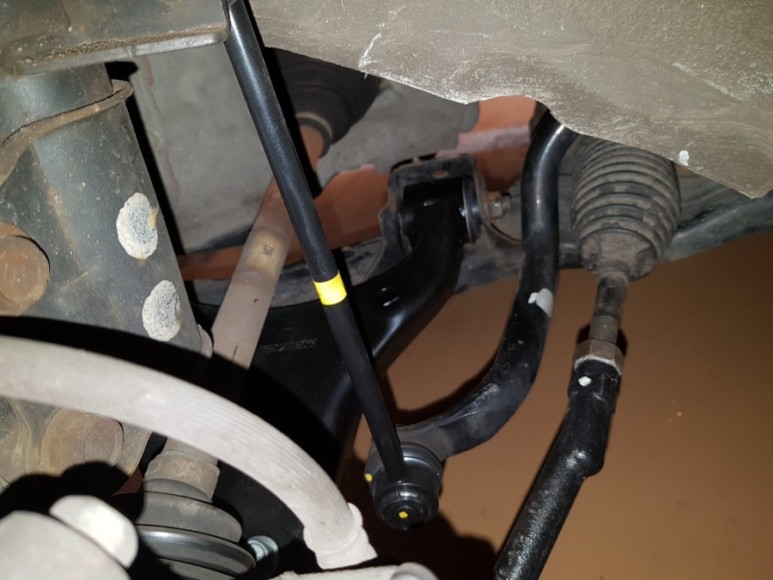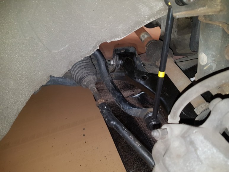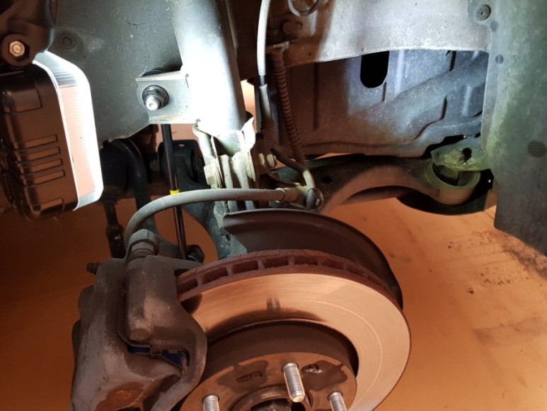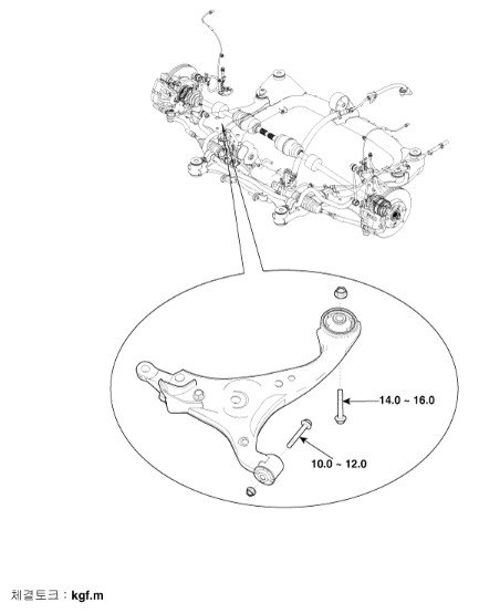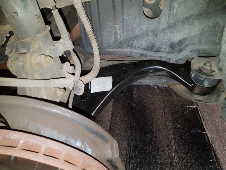마지막으로 디스크 로터 밑에 작키를 받치고 서서히 올려 준다. 그러면 서스펜션에 하중이 걸리게 된다. 부싱이 들어간 부품을 조일 때는 항상 공차체결로 마무리해야 한다. 그렇지 않고 리프트 된 상태에서 바로 조이면 서스펜션에 하중이 걸리는 순간 부싱이 뒤틀리게 된다. 4주식 리프트라면 어렵지 않게 공차체결이 가능하나 노상 다이 입장에서는 이게 최선이다. 작키를 올리는 높이는 하중이 서스펜션에 온전히 걸리도록 해 주어야 하기에 작키를 올리다 보면 안전말목에 놓여 있는 차량 하부가 약간 들썩이는 순간까지만 해 주면 서스펜션에 하중이 걸린 상태가 된다. 서스펜션에 하중이 걸린다는 의미는 타이어를 끼우고 차가 지상에 놓인 상태를 의미하는데 이렇게 해 주면 비슷한 효과를 기대할 수 있다. 이 상태에서 소 부싱, 대 부싱 고정 볼트/너트를 최종 토크로 조여 준다. 대 부싱(14 ~ 16 kgf.m), 소 부싱(10 ~ 12 kgf.mm) 역시 토크 렌치를 이용해서 조임.