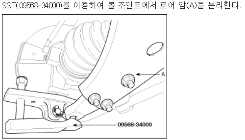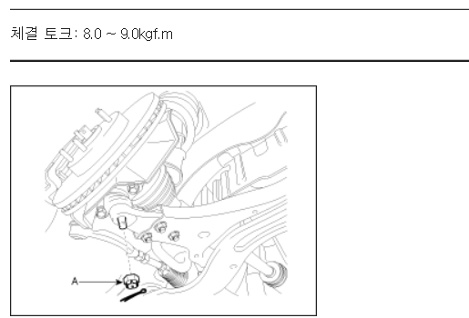 신품 볼 조인트를 너클에 고정해 준다. 볼트 2개만 조이면 된다. 조임 토크는 10 ~ 12 kgf.m.