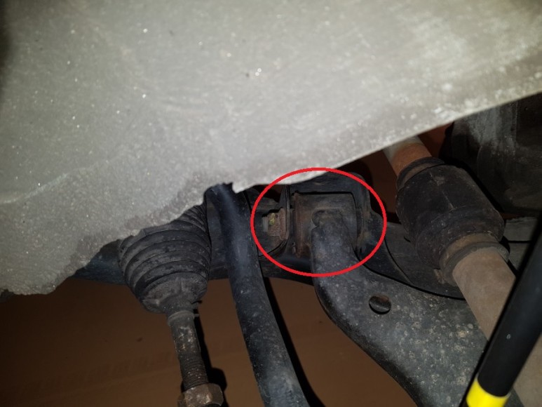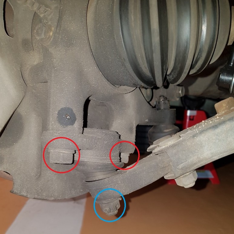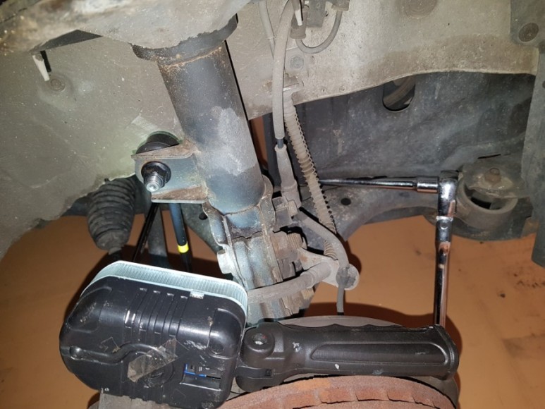 소 부싱 고정 볼트 17mm/너트 17mm를 푼다. 한쪽은 박스 렌치를 끼우고 반대쪽에서 소켓 렌치를 이용하여 분리. 소켓 렌치에 연장대를 끼우고 플렉시블 소켓 조인트에 소켓 끼우고 옆쪽에서 접근한다.