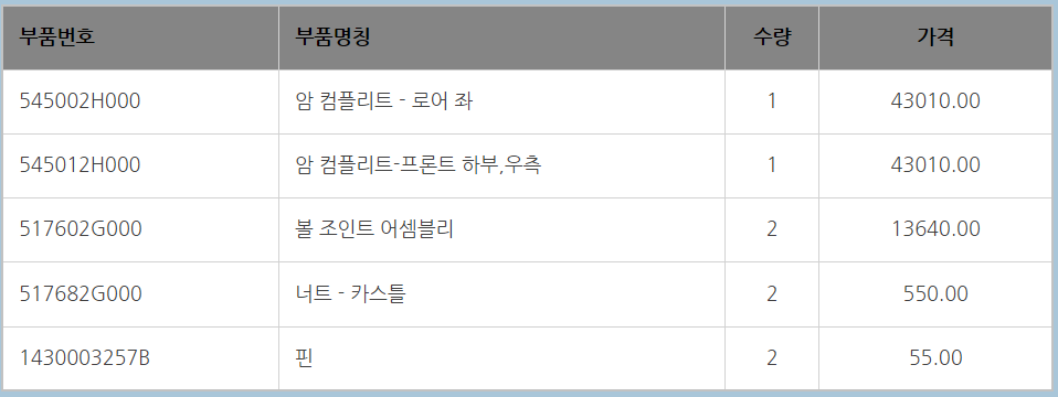 모비스 순정품으로 로워 암 2개, 볼 조인트 2개를 구입하면 총 113,300원이 소요되나 대체품으로 총 79,000원에 구입 완료. 부품비로만 약 32,000원 절약. 절약한 돈으로 공구질. 클클...