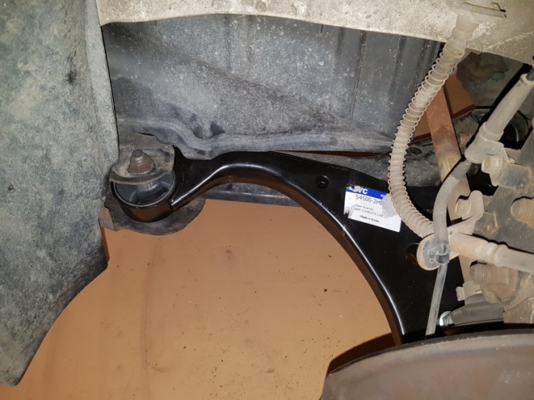 로워 암의 대 부싱부터 자리에 꽂아서 구멍을 일치시켜 볼트를 끼워주고 그리고 소 부싱을 자리에 꽂아서 역시 구멍 일치시켜 볼트를 끼운다. 볼트 구멍은 부싱 구멍과 일치하지 않으면 볼트가 끼워지지 않으니 드라이버를 구멍에 꽂아서 이리저리 왔다리 갔다리 조정하면서 맞춰주면 된다. 구멍이 일치했는데도 볼트가 쑤욱 안 들어가고 저항이 있으면 망치로 가볍게 쳐서 밀어 넣으면 된다. 볼트 끼우고 반대편에 너트로 결속한다. 이때 2곳 모두 살짝만 조여 놓는다.