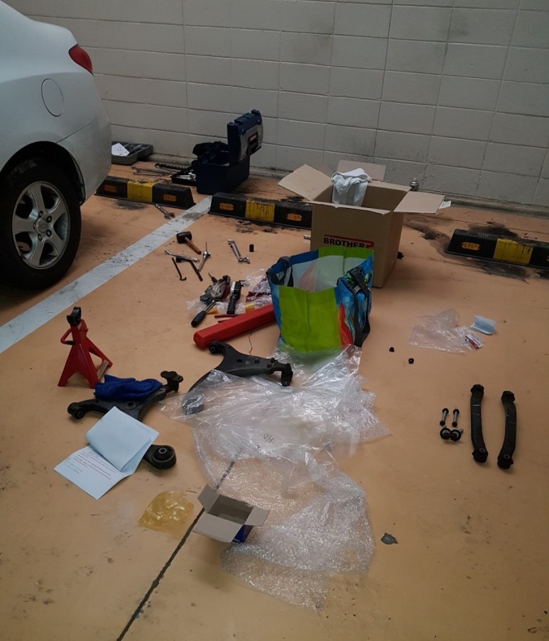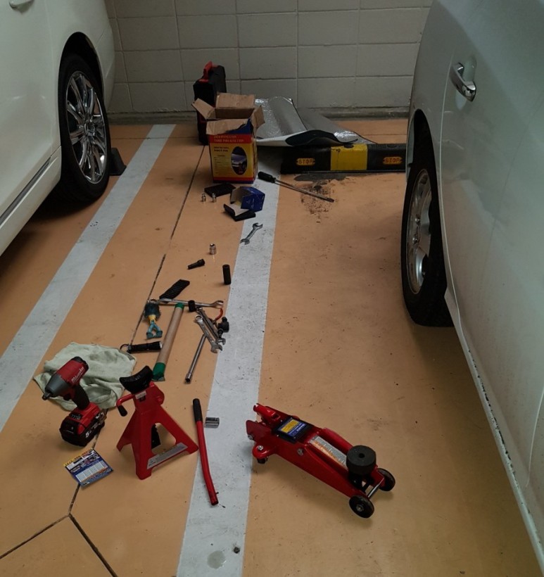 (사실 볼트/너트 고착이 무서워서 작업 2주일 전부터 풀어야 할 볼트/너트에 penetrating oil을 며칠 간격으로 여러 차례 뿌려 주었다. 이러면 설령 고착되었던 볼트/너트일지라도 차량 주행 중에 뿌려둔 오일이 조금씩 틈새를 파고 들어가서 윤활 작용을 이끌어 내게 되고 녹으로 고착되었던 볼트/너트가 실제 작업 시에 수월하게 풀리기도 한다.
