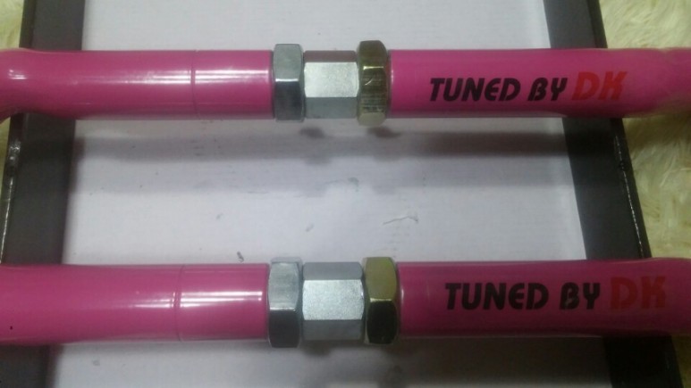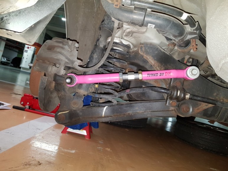 교체 후 블링블링한 자태의 리어 어퍼 암 되시겠다. 핑크색이라니 ㄷㄷㄷ. 이 제품은 원통형인데 가격이 조금 더 비싼 제품은 육각봉 형태이며 육각봉 형태 제품의 강성이 좀 더 좋다고 한다. 근데 뭐 서킷 달리는 것도 아닌데 걍 싼마이로 하는 거지. 순정품에 비하면 이 정도면 감지덕지다. 사제품 제조사도 여러 곳이 있는데 젤 싼 걸로 구입하면 된다. 제품 품질은 다 거기서 거기다.
