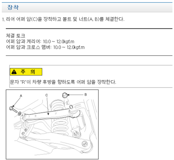 이때 사제품 암의 길이를 기존 탈거한 어퍼 암의 길이와 동일하게 맞춘 후에 장착해 주어야 한다. 길이를 맞추는 방법은 간단하다. 눈대중으로 하지 말고 탈거한 볼트를 이용하여 탈거품/신품을 겹쳐 놓고 볼트를 부싱 구멍에 넣어서 길이를 동일하게 맞추면 된다. 이런다고 캠버 값이 작업 전/후 변화가 없진 않으나 얼라인먼트 보기 전까지는 어쨌든 그 변화를 최소화시켜야 한다.
