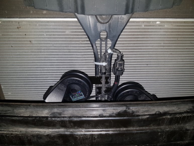 순정 띡띡이 싱글 혼을 떼어 버리고 듀얼 혼을 장착하면 끝. 혼 고정 10mm 볼트 1개로 혼 2개를 한 구멍에 ^ 모습으로 체결시키는 방법이 있고, 순정 혼 자리 바로 밑에 친절하게 듀얼 혼을 장착하라고 볼트 구멍이 1개 더 있으니 로우 피치와 하이 피치를 각 구멍에 체결해도 된다. 단 후자로 할 경우 10 mm 볼트를 미리 준비해야지. 10 mm 순정 볼트 품번은 11251 06206B (110원) 되시겠다. 혼의 나팔 방향이 반드시 아래쪽을 향햐도록 설치해야 한다. 안 그럼 빗물이 유입되어 혼이 쉽게 고장 나니까 말이다.