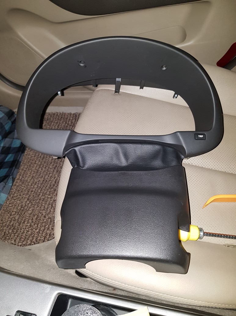 여기서 문제. 아래 사진 참고. 클러스 페이셔 판넬은 상단 나사 2개만 풀면 탈거되지 않더이다. 정비매뉴얼 설명이 부실하네. 스티어링 컬럼 쉬라우드 어퍼 커버와 클러스터 페이셔 판넬이 가죽 부트와 연결되어 있다. 고로 쉬라우드 어퍼 커버와 같이 붙어 있는 상태로 탈거된다. 쉬라우드 어퍼 커버는 로워 커버 쪽 나사 1개와 핸들을 좌/우로 돌리면 어퍼 커버 쪽에 숨겨있는 나사가 각각 1개씩 있으므로 제거 후에 어퍼/로워 커버 틈새를 벌리면 탈거된다.