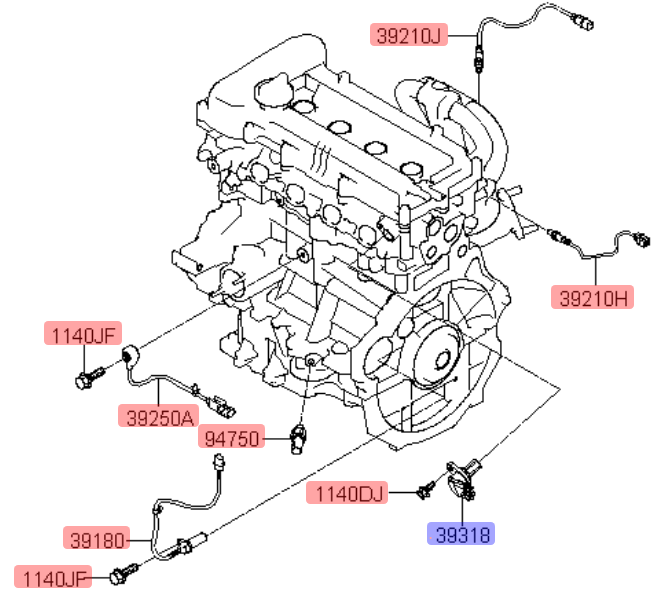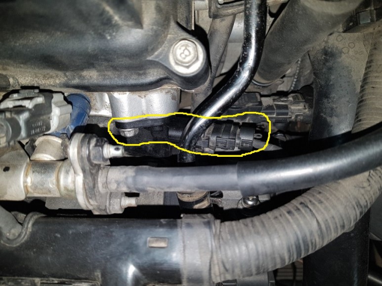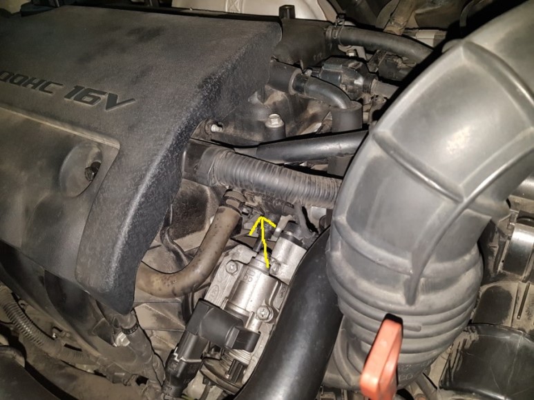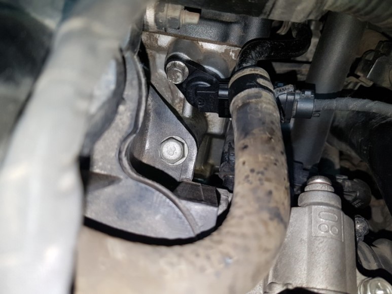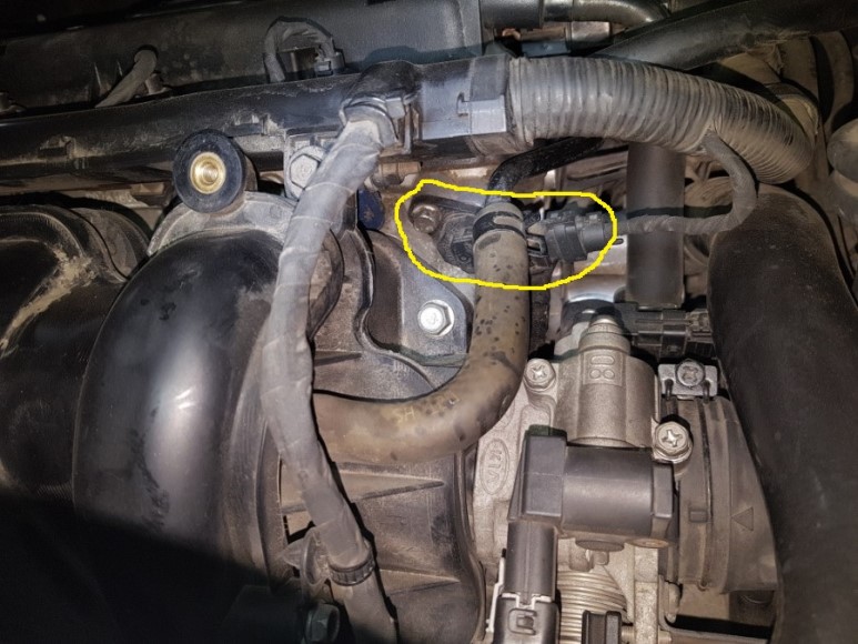 엔진 커버를 떼내면 좀 더 잘 보인다. 센서를 가리면서 가로지르고 있는 호스는 브레이크 부스터로 연결되는 진공라인이다.