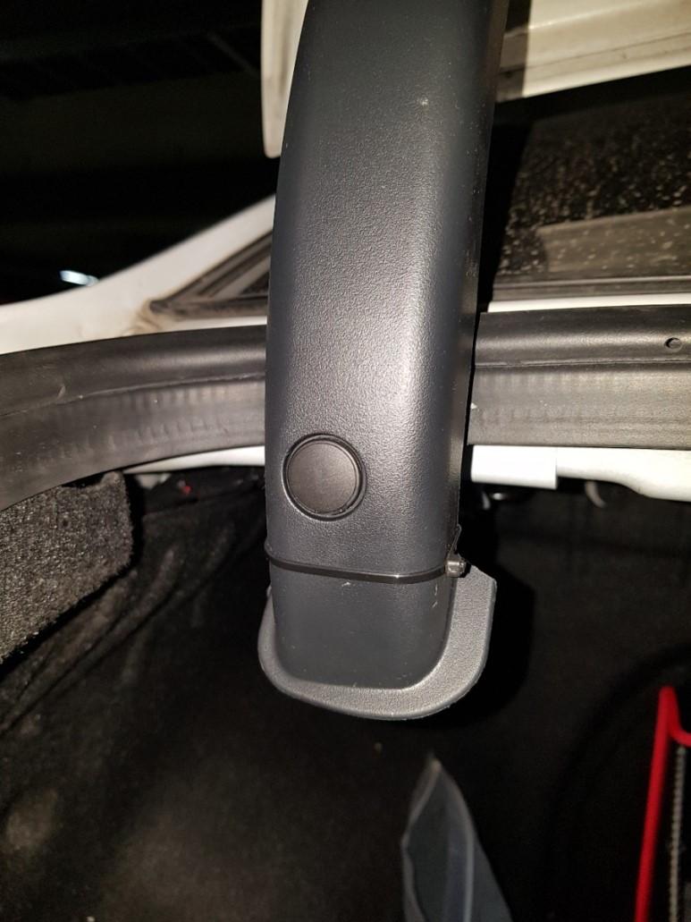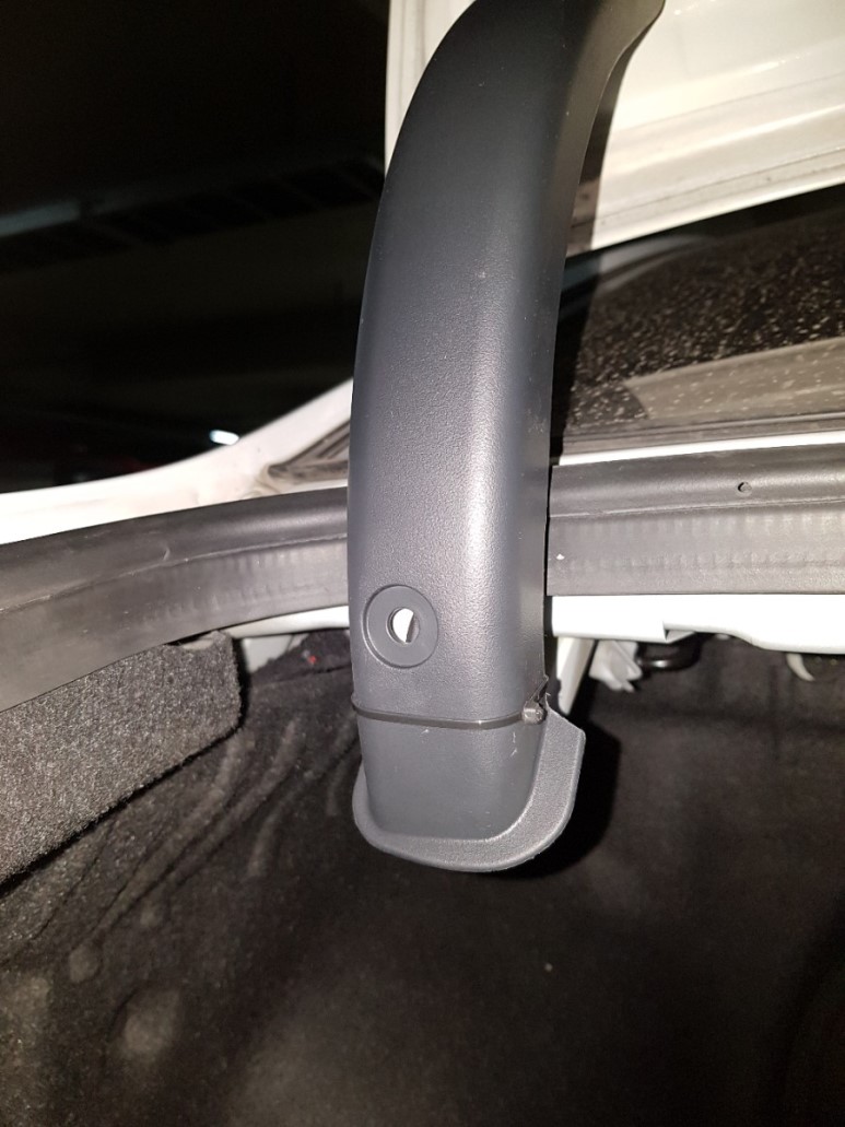 작업 편의성을 위해서 트렁크 리드 내장재를 탈거한다. 내장재에 가려져 있던 힌지 고정 볼트가 보인다. 아래쪽 순정 볼트를 제거하고 커버를 구멍에 맞춰서 제거했던 순정 볼트로 커버 위쪽을 고정한다.