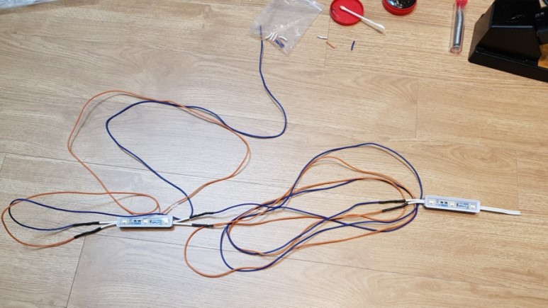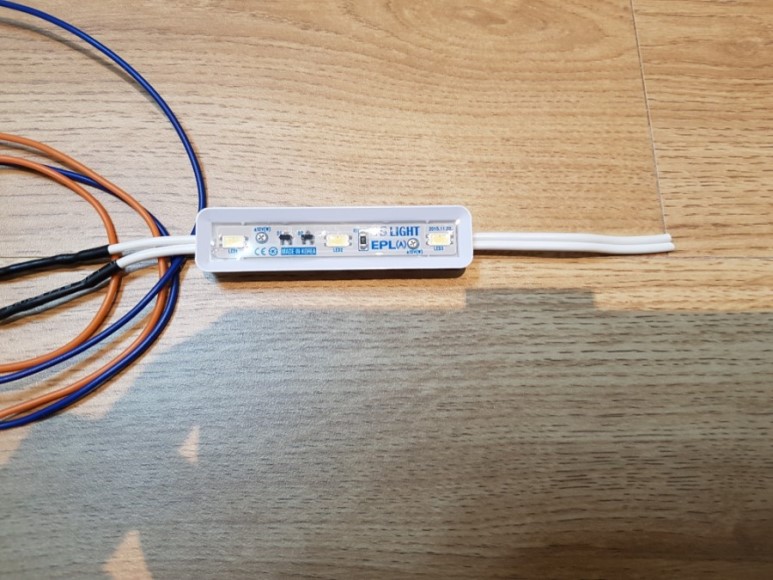 우선 간판용 LED에 배선을 충분한 길이로 미리 작업해 놓는다. 납땜하고 수축튜브 씌우고까지. 납땜기가 없으면 걍 배선 꼬아서 연결하고 절연테이프 처발처발 해도 됨.