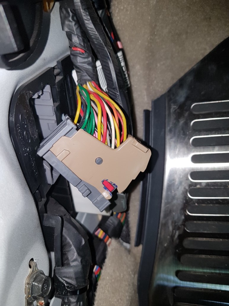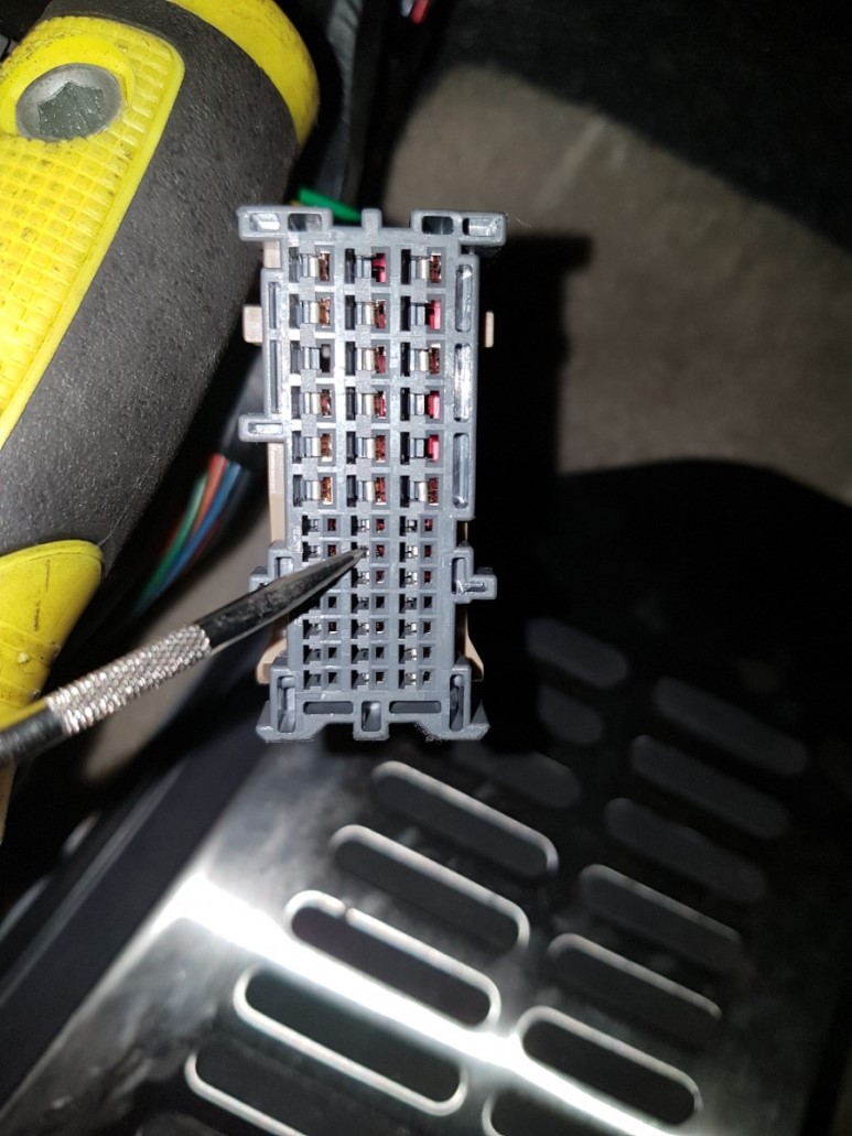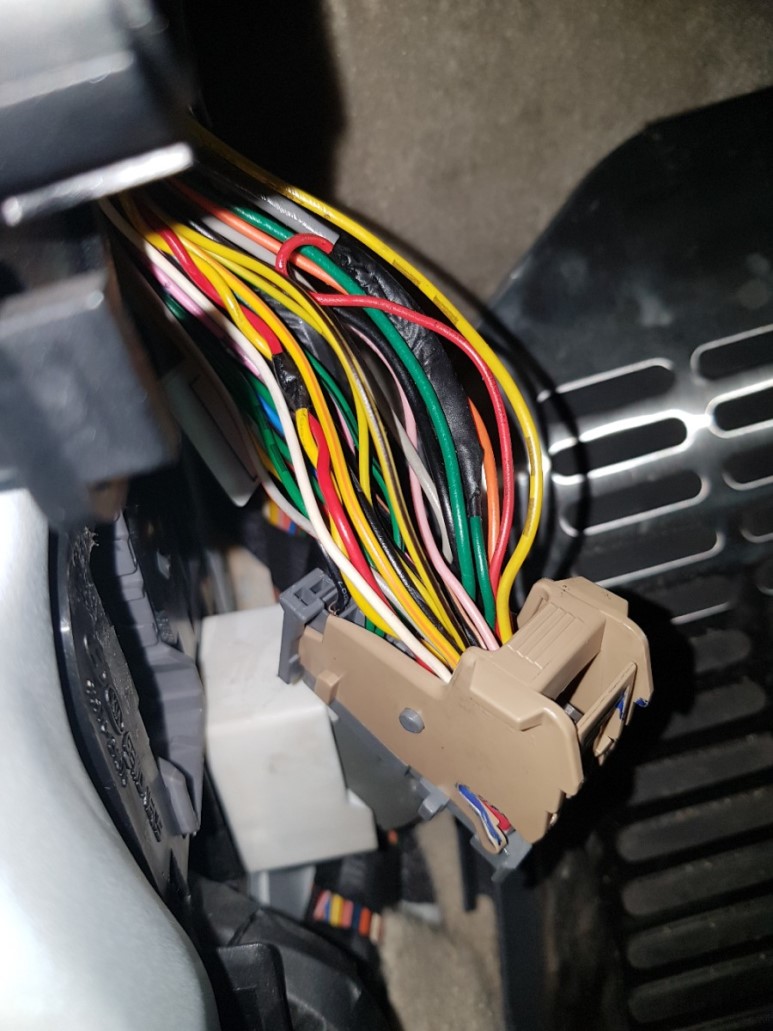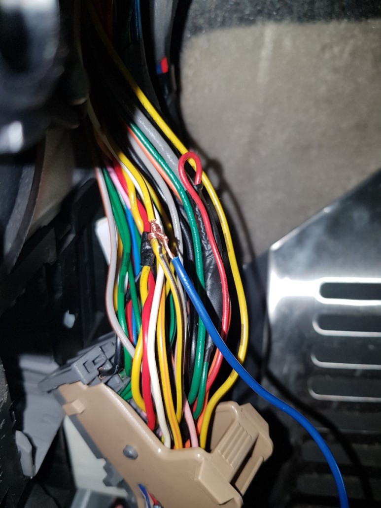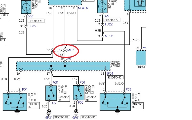 MF12 커넥터를 분리해서 암놈 커넥터를 기준으로 19번 노란색 선이 도어 스위치 배선이다. 근데 도저히 배선 다발이 얽혀 있어서 19번 배선을 찾을 수 없다. 카페 게시글을 검색하니 노란색에 검은띠 줄이 있는 게 19번선 이란다. 전장회로도가 제대로 되어 있으면 아무 문제가 없는데 전장회로도엔 그냥 노랑이라고만 나와 있으니 원. 실제로 노란색 배선이 여러 개라 구분이 안된다.