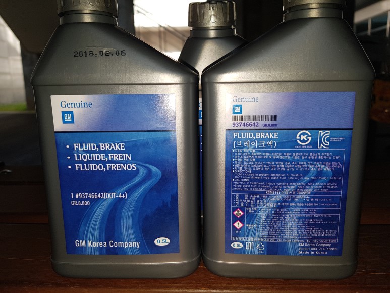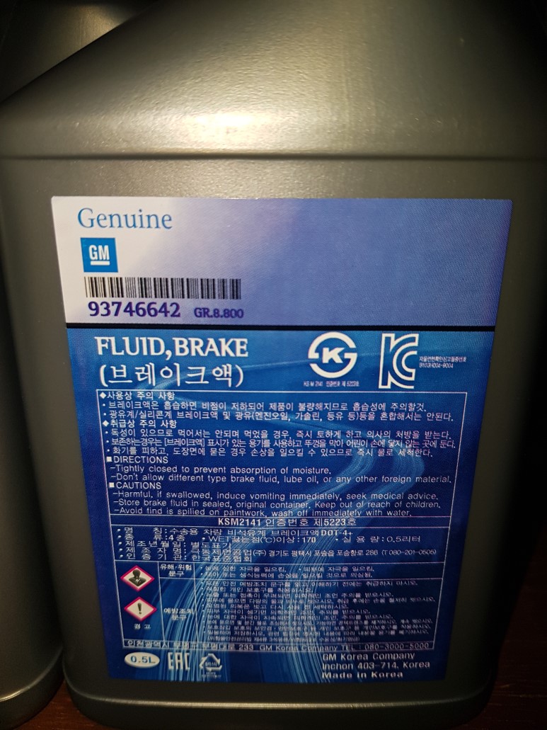 브레이크 액은 가성비 최고로 알려진 쉐보레 순정 DOT 4+. 품번 93746642 (500mL 용량). 통당 5,390원. 3통 구입.