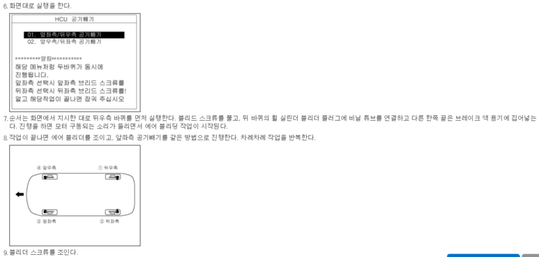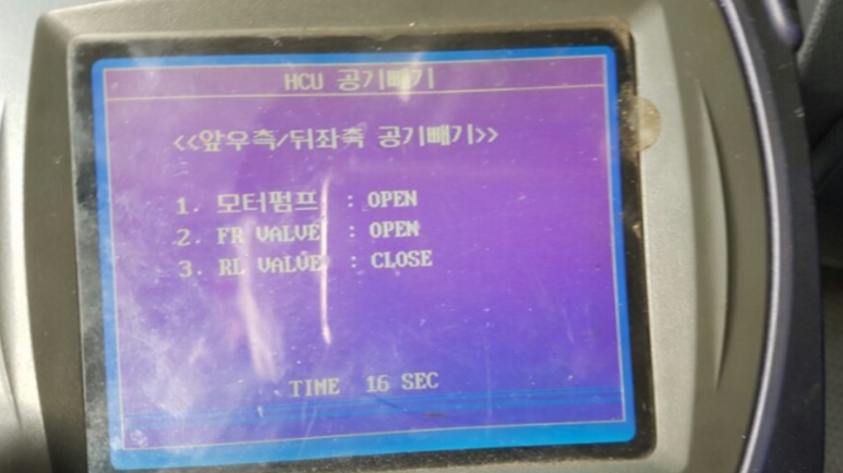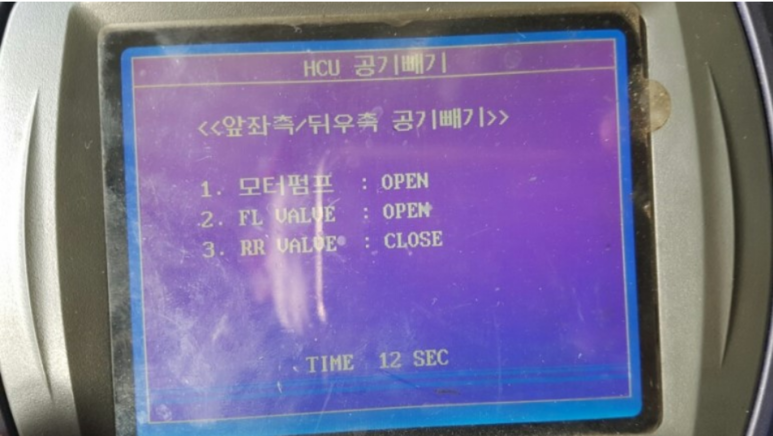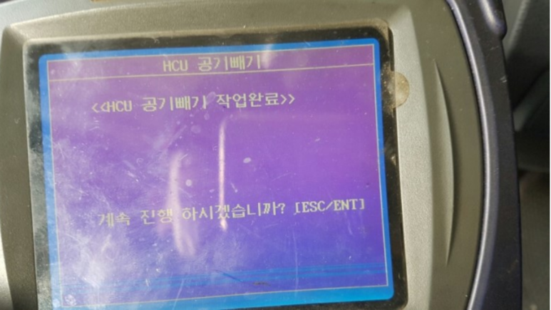 인터넷으로 찾은 사진 (결론은 연식이 좀 된 차량은 이 포스팅 글에서 설명하는 방법으로 HCU 에어 빼기가 되고, 최근 연식에서는 별도로 블리더 스크류를 열지 않고 60초 동안 ABS모듈의 모터와 밸브를 강제 구동시켜서 에어 빼기를 하는 듯. K9하고 LF소나타는 예전에 시험해 봤을 때 후자의 방식이었음). 이렇게 방식이 다른 것은 연식 문제도 있고 스캐너 제조사마다 조금씩 방법이 다를 수도 있는 것 같다. 비전문가가 전문가의 영역을 기웃거려서 파악한 거라 정확하지 않을 수 있음.