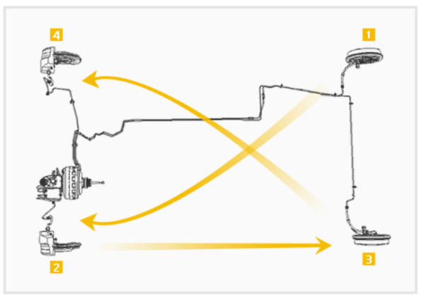 5. 수동 에어 빼기는 아래 그림 순서대로 할 것. 실제 정비소나 많은 다이어들이 이 순서를 잘 못 알고 있는데 그 순서가 이렇다. 조수석 뒤(Rear Right; RR) --> 운전석 뒤(Rear Left: RL) --> 조수석(Front Right; FR) --> 운전석(Front Left: FL). 요게 잘못된 순서다.