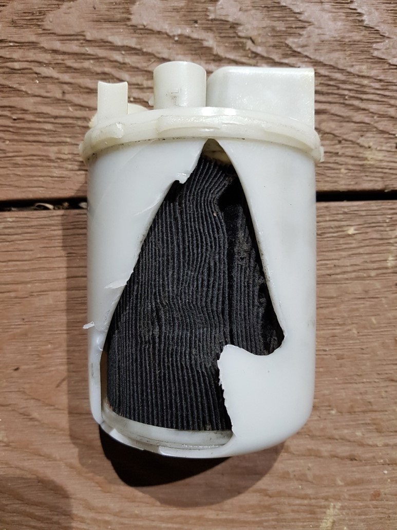 작업 다음 날 탈거한 헌 필터 내부를 보고자 망치로 무지막지하게 몇 차례 때려서 하우징 겉을 깼다. 흐미. 필터 종이가 완전 시커먼스. 작업할지 말지는 각자의 판단에 따라서. 10만 km 미만이라면 굳이 할 필요 없다고 강력하게 주장하는 바임. 저주받은 손이라면 어셈블리로 교체할 것. 인터넷 잘 찾으면 대체품으로 8만 원 안 되는 가격으로 구입할 수 있음. 모비스 신품은 12만원이 조금 안되는 가격.