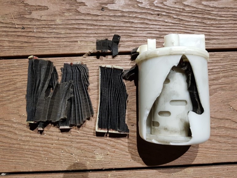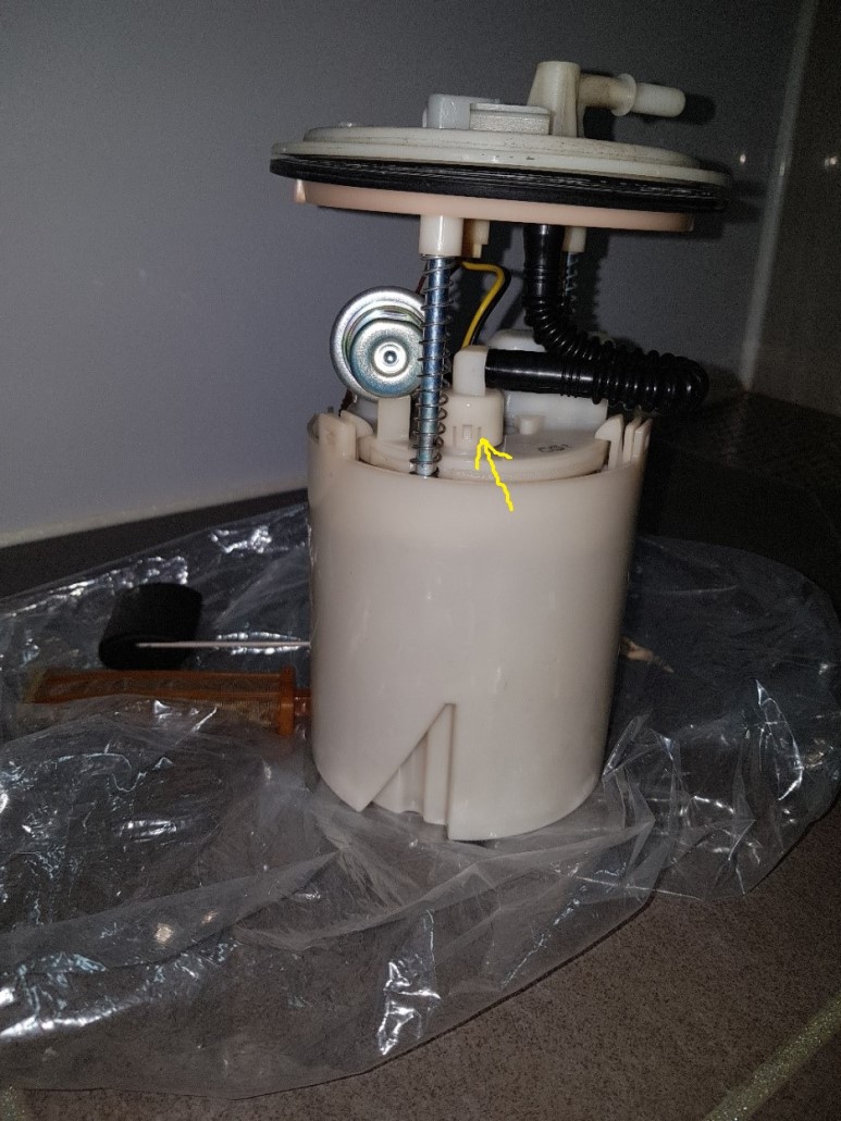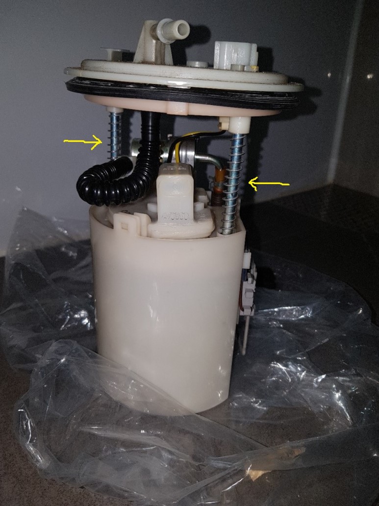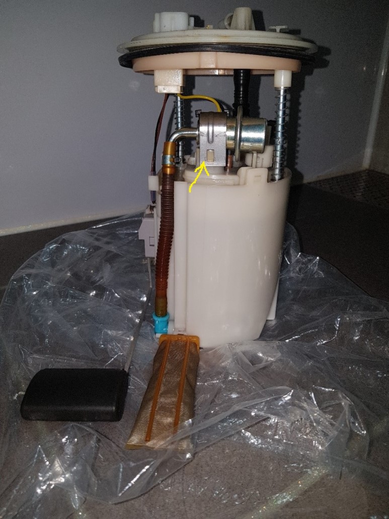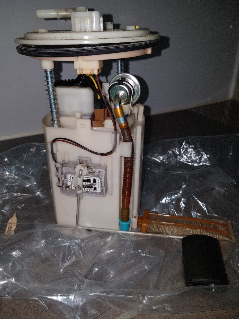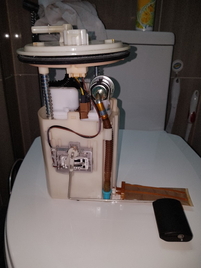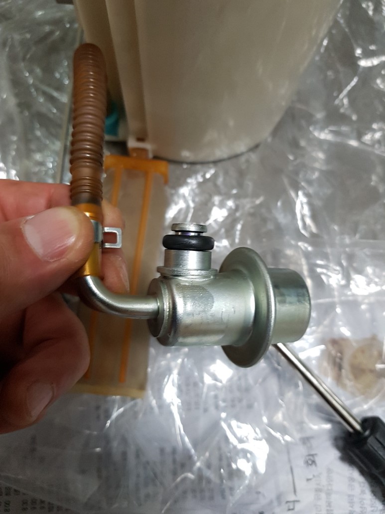 탈거한 연료 필터 어셈블리를 들고 집으로 갖고 가서 화장실에 작업. ㅋㅋ. 펌프 모터, 필터, 연료 압력 레귤레이터, 연료 센더(연료량을 측정하는 게이지) 등이 다 붙어 있다. 이걸 하나씩 하나씩 분리해야 한다. (사진을 여러 각도에서 찍어 놓으면 재조립 시에 도움이 된다. 아무 생각 없이 분해했다가 조립할 때 난감해질 수 있음)