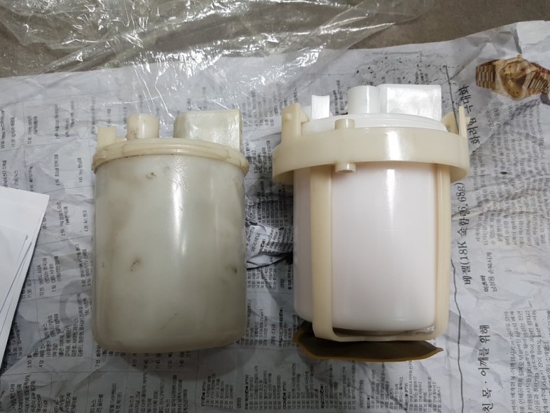 분리한 필터와 신품 필터 비교. 11년이 지났기에 당근 헌 필터는 플라스틱 하우징 때문에 제대로 볼 순 없지만 내부가 시커먼스 상태다. 서비스로 이 포스팅 후반에 헌 필터 내부의 시커먼스 사진이 있음.