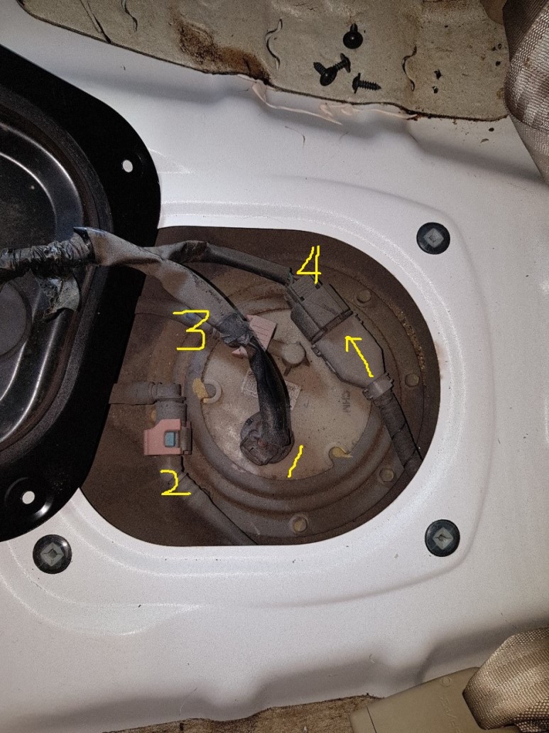 1: 연료펌프 메인 커넥터, 2: 진공 튜브 커넥터(리턴), 3: 연료 공급 튜브 커넥터, 4: 캐니스터 클로즈 밸브 커넥터. 4번은 커넥터를 분리 후에 커넥터 몸통이 고정되어 있으므로 화살표 방향으로 밀어서 분리하면 된다.