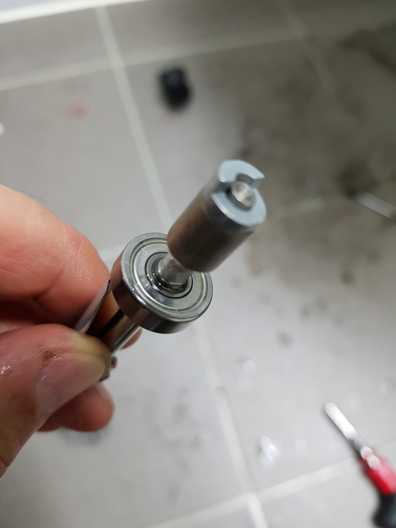 베어링 안쪽으로는 WD40을 뿌려서 내부에 남아 있는 오래된 구리스 잔류물을 모두 녹여낸다. 구리스가 모두 녹아서 빠진 후에 베어링을 돌려보면 그르르르륵 하는 베어링 굴러가는 소리가 난다.