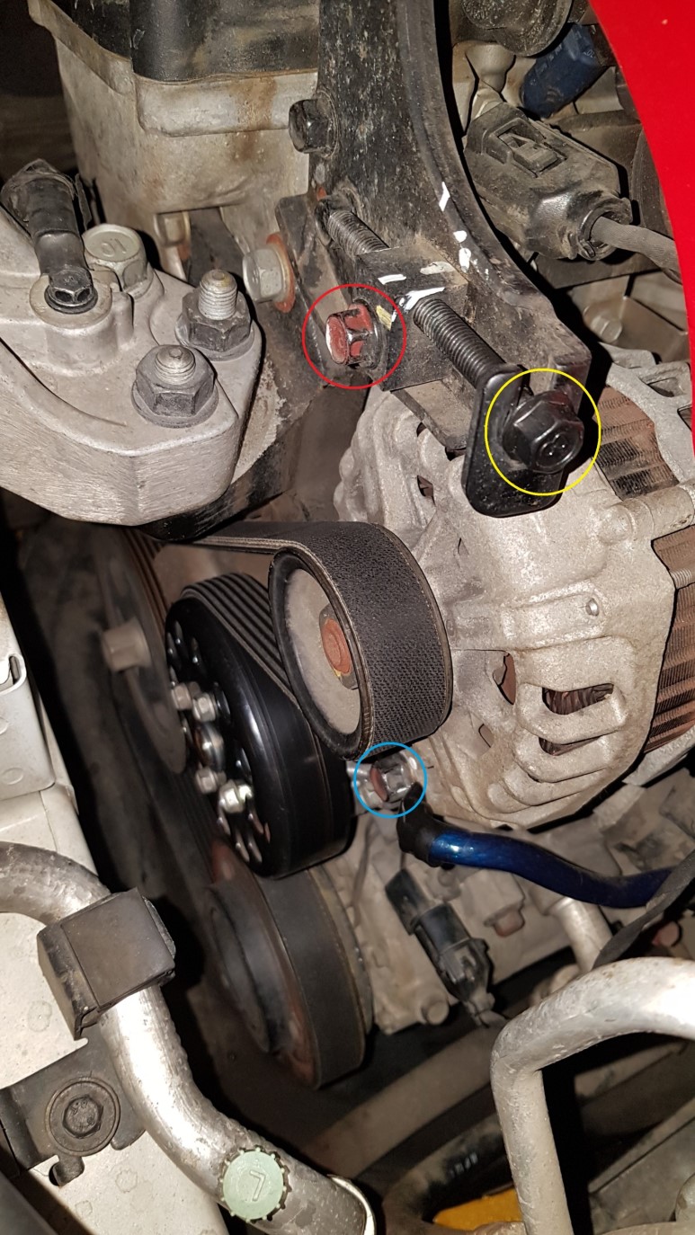 아래 사진의 바로 빨강 원으로 표시한 12mm 볼트를 먼저 느슨하게 푼 상태에서 노랑 원의 장력 조절 볼트를 조여야 한다. 니기미... FM방식은 빨강 원의 12mm 볼트 느슨하게 하고 파랑 원의 14mm 볼트 느슨하게 해 준 후에 노랑 원의 장력조절 볼트를 조여야 한다. 느슨하게 할 때도 마찬가지다. 특히 빨강 원의 12mm 볼트를 느슨하게 하지 않고 장력조절 볼트를 조이거나 풀면 알터가 전/후로 잘 안 움직이기 때문에 벨트 장력 조절이 잘 안된다.