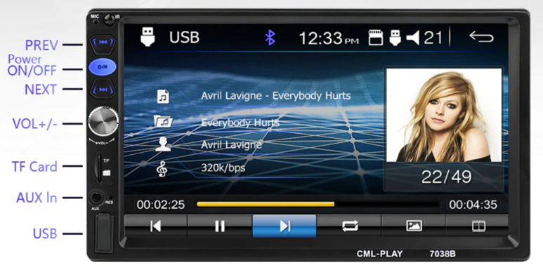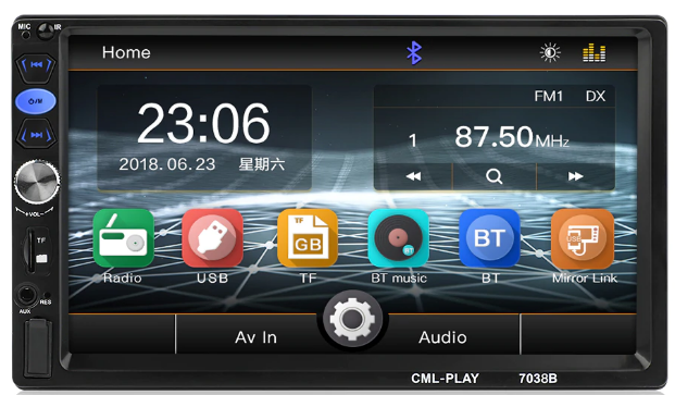 알리에서 구입. 7인치 터치스크린. AUX, USB, TF 메모리카드 지원, 라디오, 오디오(MP3, WMA, WAV, OGG, FLAC 등 오디오 코덱 지원), 비디오(AVI, MP4 등), 블루투스(핸즈프리 전화 포함) 기능, 후방카메라 입력 기능, 안드로이드 스마트폰 전용 미러 링크 기능, 스티어링 휠 리모컨 지원 기능, 1024 x 600 해상도 지원.