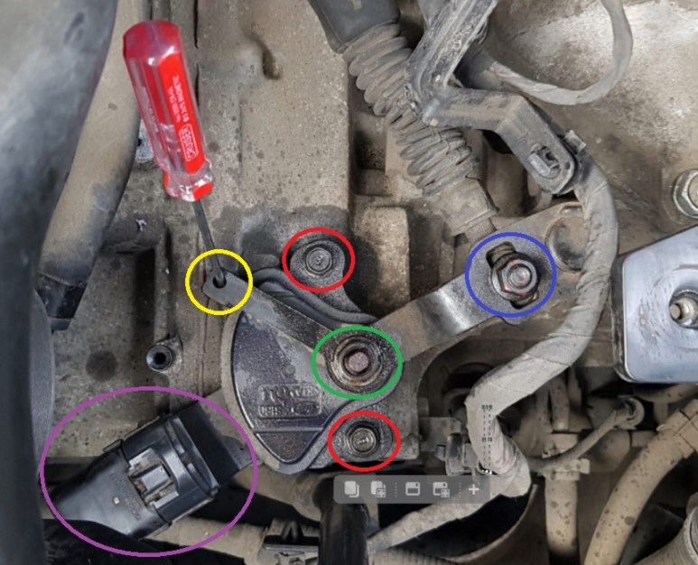 7. 노란색 원 구멍에 송곳, 드라이버 또는 육각렌치 등 굵기가 얇은 녀석을 꼽아서 고정. 이거 고정하지 않으면 샤프트 너트(가운데 녹색 원) 풀 때 쇠막대기(레버. ㄱ자가 뒤집혀 있는 놈)가 움직임. 기어를 N에 놓으면 레버 구멍과 인히비터 스위치 구멍이 딱 일치하게 되어 있다.