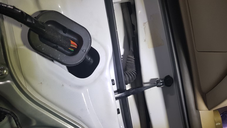도어 체커 가까운 곳에 굵은 배선 다발이 판넬을 통과하고 있는 곳이 있다. 막혀있는 고무마개를 열고 체커가 안으로 떨어지지 않도록 밖에서 체커를 한 손으로 잡고 다른 손을 구멍에 집어넣어서 체커를 빼낸다. 고무마개 구멍이 작기 때문에 손이 크면 쪼매 거시기하다. 만약 안쪽으로 체커를 떨어뜨리면 이 역시 애먹는 길이 훤히 트이니까(판넬 전체를 탈거해야 됨) 조심할 것. 사실 스피커를 탈거하면 제일 편한데 아방이는 스피커가 리벳으로 고정되어 있어서 리벳 제거하려면 드릴을 써야 하고 다시 스피커 장착할 때에도 리벳으로 마무리(물론 철판 피스로 확 조여도 됨) 해야 하는 등 번거롭기 그지없어서 스피커 탈거를 안 하고 작업하는 방법을 쓸 수밖에 없다.