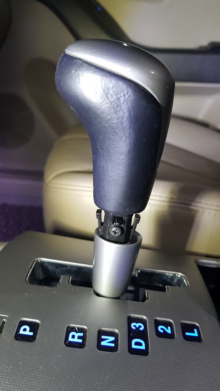 1. 순정 기어봉 탈거 - 기어 N 상태에서 하단의 스커트를 힘으로 돌려서 빼내면 숨겨진 나사가 하나 있다. 나사 푸르고 기어봉은 위로 잡아 뽑으면 쉽게 빠진다.