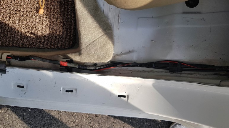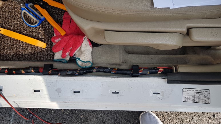 - 리어 도어 스커프(고정 스크류 1개 숨어 있음. 리어 시트를 탈거해야 보임. 스크류 풀지 않고 도어 스커프 잡아당기면 스크루 쪽 깨짐)를 탈거해서 연장 배선을 순정 배선 다발을 따라서 주욱 이어가서, B필러 하단(탈거하지 않고 살짝 들어서 틈새로 배선 집어넣음)을 통과하고 역시 프런트 도어 스커프를 탈거해서 연장 배선을 주욱 이어 나간다.