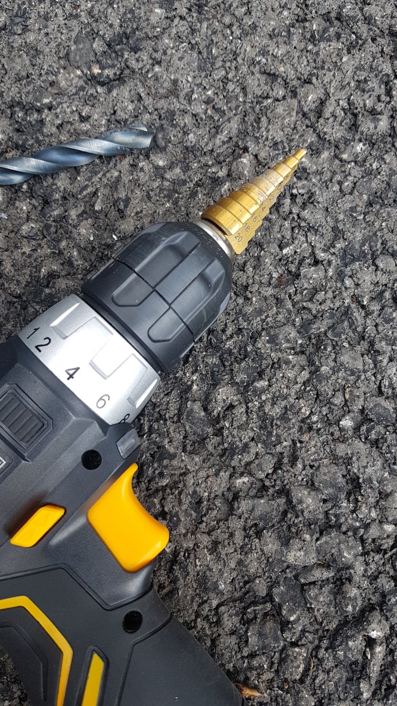 4. 탈거한 가니쉬에 16파이 구멍 뚫기 - 스텝 드릴 비트로 파팍 뚫어줌