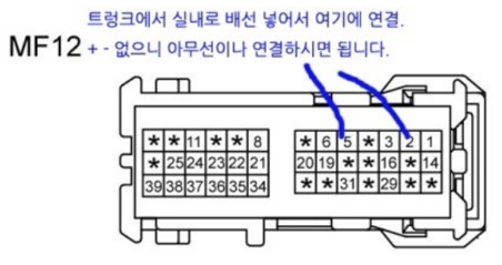 전장회로도에 따르면 MF12 커넥터의 2번 단자는 운전석 도어 록/언록 신호이다. 5번 단자는 트렁크 리드 스위치 오픈 신호이다. 이렇게 2개의 배선에 외부 스위치를 결선하면 도어 록 상태에서는 외부 스위치를 눌러도 트렁크가 열리지 않게 된다.