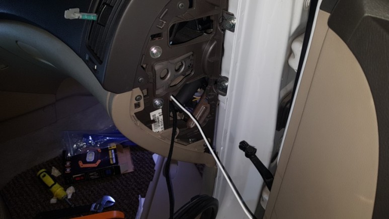 GPS 안테나는 조수석 A 필러 하단 구석에 자리 잡을 거라서, 이거 미리 A 필러로부터 센터페시아센터패시아 쪽으로 배선을 넣어줘야 한다. 센터패시아에서 A 필러 쪽으로 배선을 보내기 어렵다. 그 이유는 안테나 본체가 일정 크기가 있기 때문에 틈새로 먼 거리까지 찔러 넣을 수 없다. 옷걸이 철사를 이용해서 A 필러 --> 크래쉬 패드 우측 사이드에서 센터패시아 안쪽으로 찔러 넣어주면 된다.