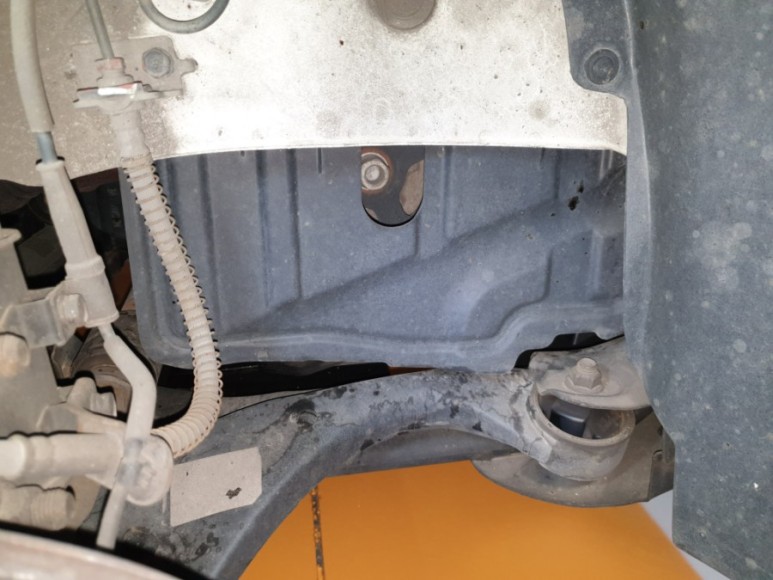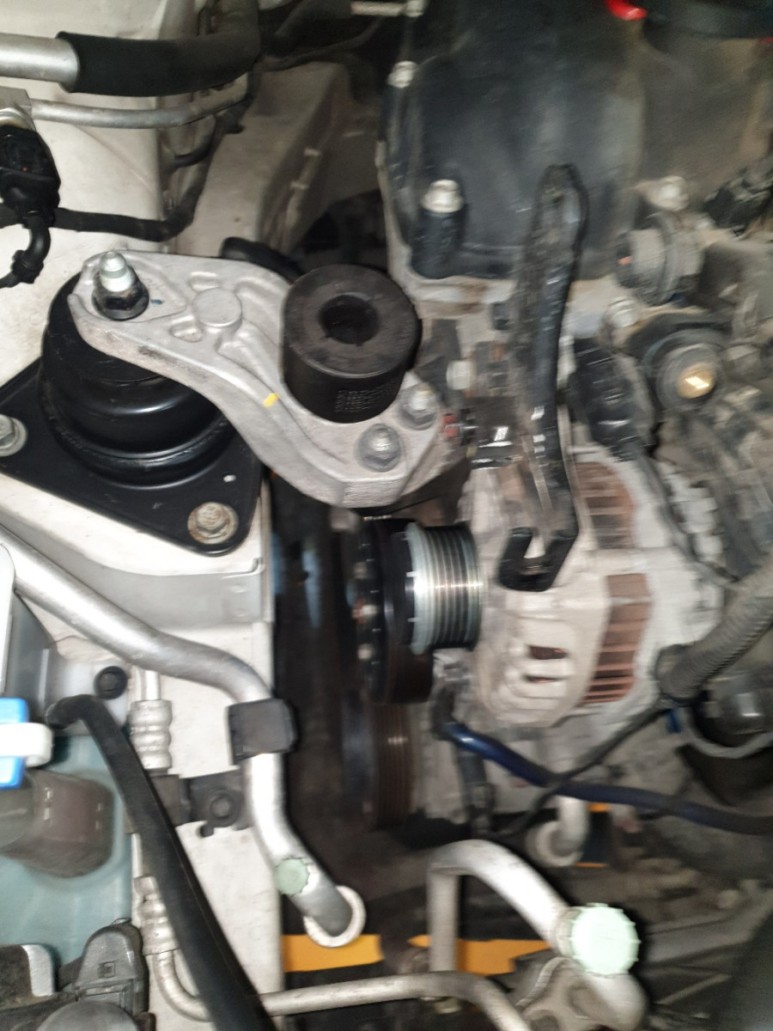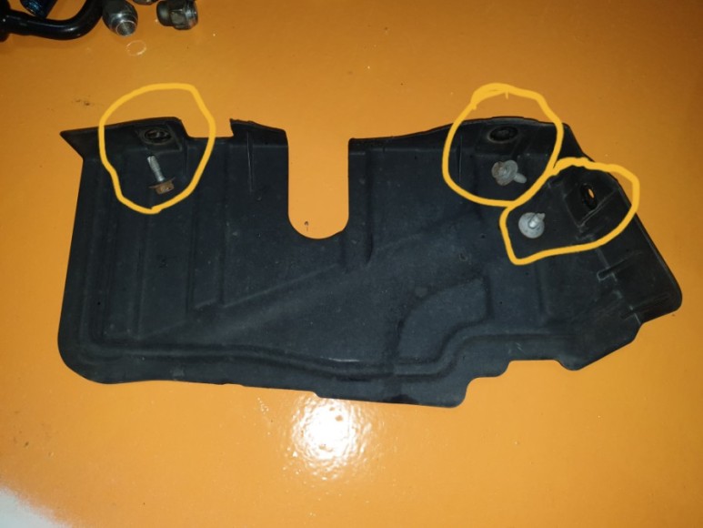 5. 조수석 휠 하우스 안쪽의 사이드 커버 탈거 (10mm 볼트 3개로 고정). 이제 댐퍼 풀리가 보인다.