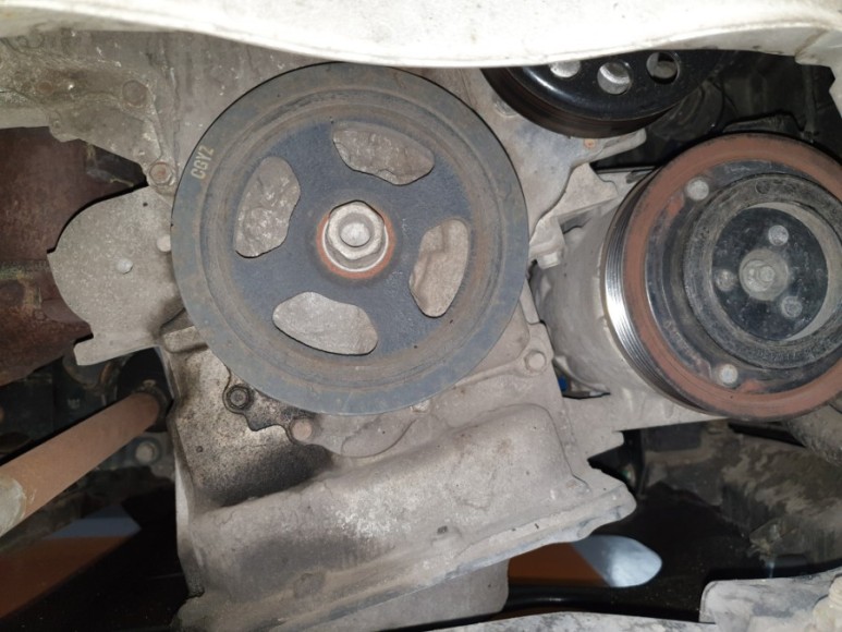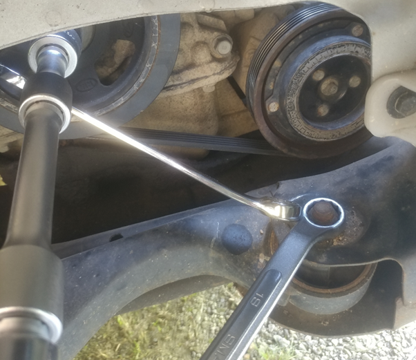 임팩 렌치가 없으면 수공구로 풀어야 하는데 이런 저런 선행 조치를 해야 한다. 왜냐면 풀리가 휙휙 돌아가기 때문에 수공구로 볼트를 풀 수 없다. 적당한 길이의 양구 스패너 같은 공구로 풀리를 고정한 후에 수공구로 푼다. 어떻게 고정하냐고? 재주껏. HD 카페에서 구한 사진 올리니 참고하시오. 머리를 굴리면 여러 가지 방법이 가능할 테니 각자 알아서 고정. 그러나 수공구로 쉽게 풀린다는 확신은 절대로 금물이오.