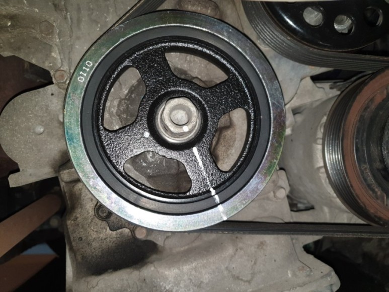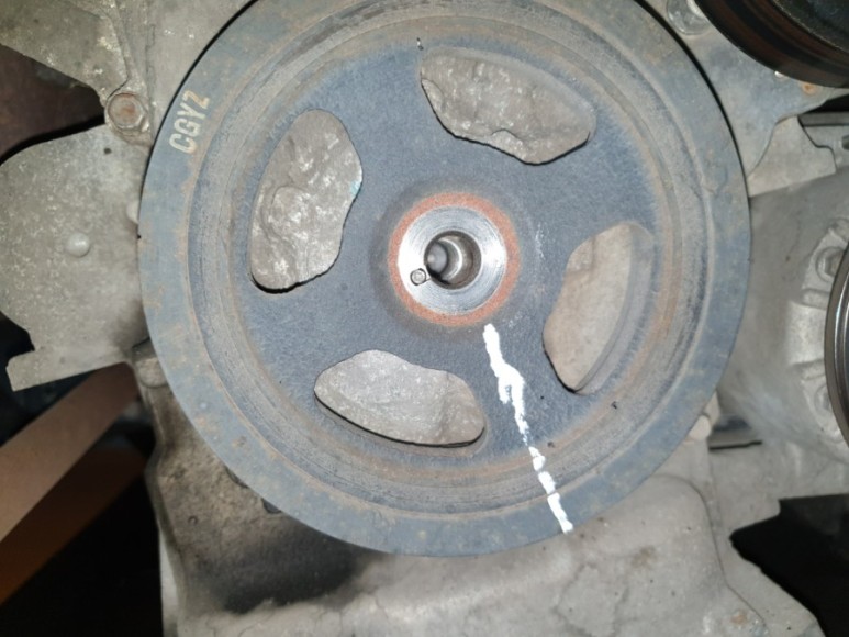 6. 댐퍼 풀리와 풀리 고정 볼트에 페인트 마커로 마킹 (나중 체결할 때 딱 요 정도만큼 조일때 참고하려고)