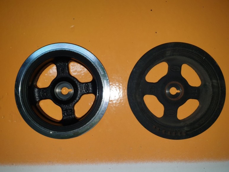 구품과 신품(개선품) 풀리 비교 샷. 신품에도 구품에 마킹한 위치와 동일하게 마킹해 준다.