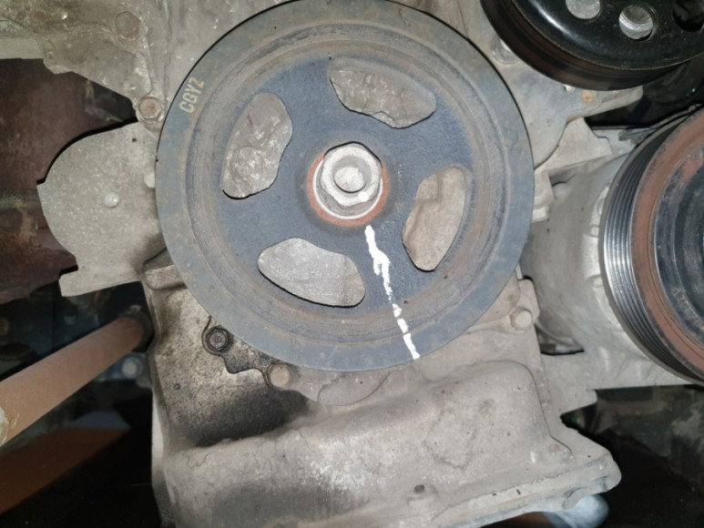 11. 신품 풀리 장착. 마킹 표시한 만큼만 조이면 됨. 체결 토크는 13 ~ 14 kgf.m라서 토크 렌치를 써 볼까 하다가 풀리를 고정해야 하고 어쩌고 번거롭다. 걍 임팩 렌치로 드득 드득 드득해서 조였음. 마킹한 표시보다 살짝 더 조였음.