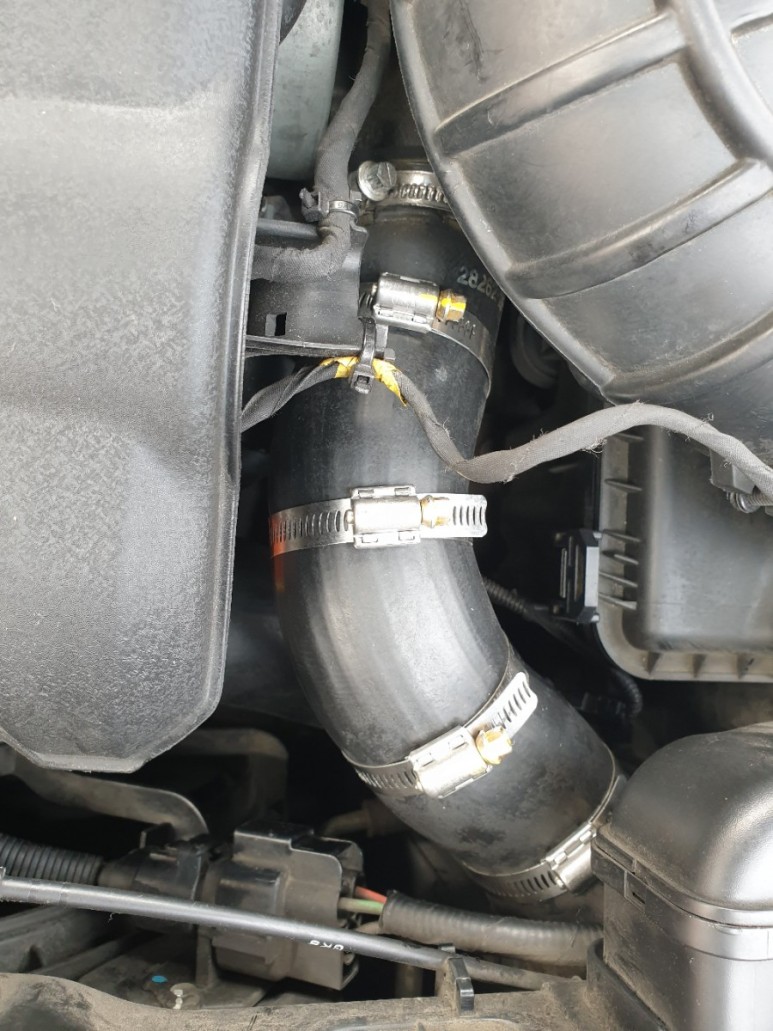 인터쿨러 호스를 탈거하지 않고 작업이 가능하다. 호스 밴드를 완전히 풀어서 작업하면 된다. 호스 중간중간 끼운 밴드는 너무 강하게 조이면 호스가 짜부되니까 적당히 호스 직경을 감싸면서 밴드가 휙휙 돌아가지 않는 선에서 조이면 된다.