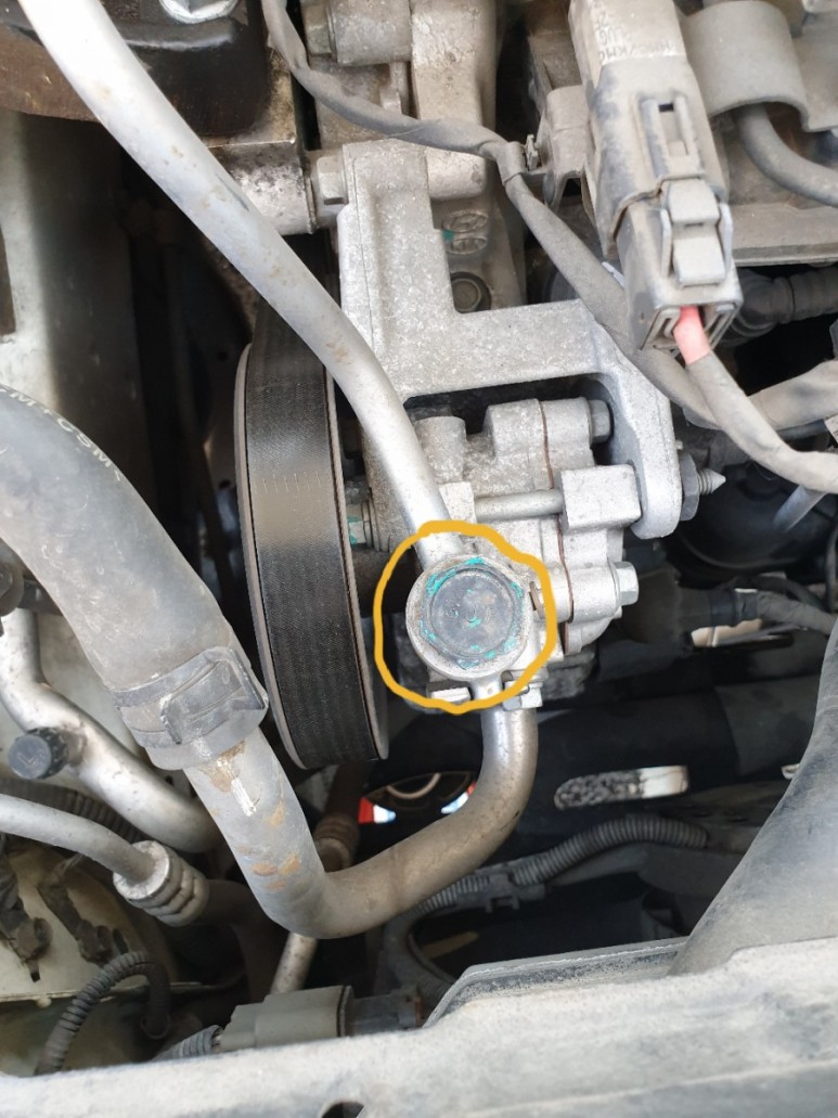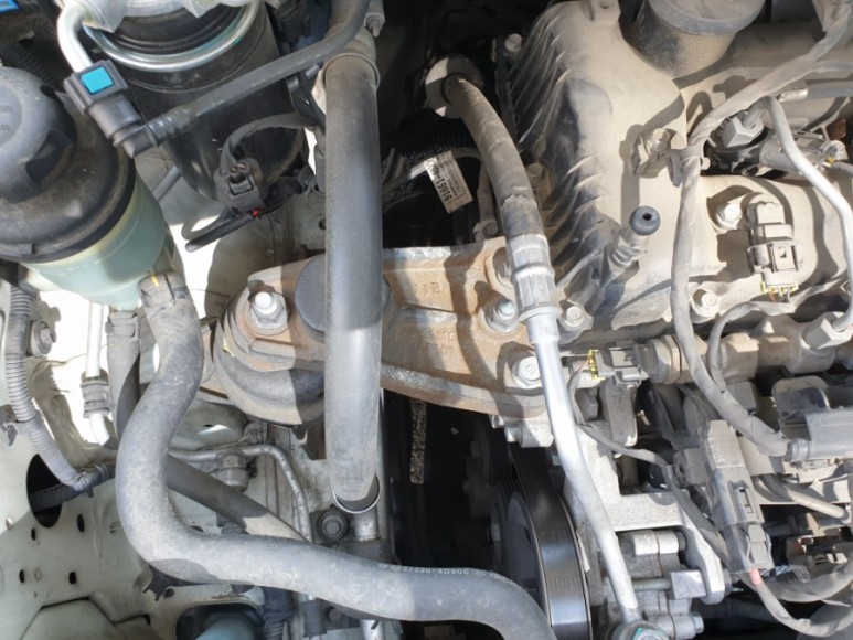바로 에어컨 컴프레서 오일 주입구인가? 저 볼트를 풀 수 밖에. 24mm 사이즈다. 살짝 풀고 호스를 옆으로 조금 이동시키면 미미 브라켓 볼트와 너트를 쉽게 풀수 있다.