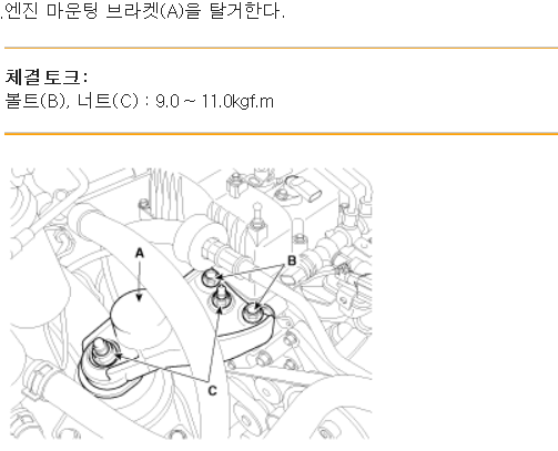 8. (필요시 작키 높이를 조정) 엔진 미미 브라켓쪽의 17mm 너트 2개, 17mm 볼트 1개를 푼다. 브라켓을 탈거한다. 브라켓이 잘 안빠지면 오일팬을 받친 작키를 약간만 높이면 빠진다.