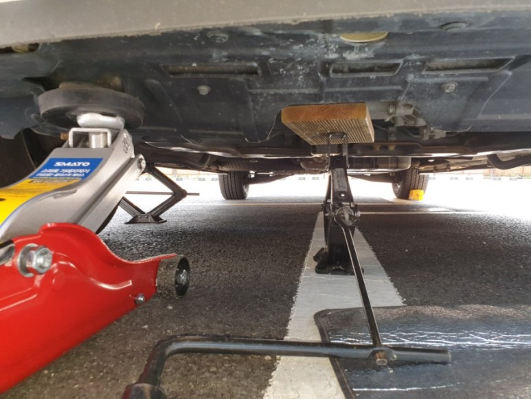 3. 작키로 엔진 오일팬 하단 모서리를 받친다. 작키 위에 두께가 있는 고무판 또는 나무판을 올리고 오일 팬을 받친다. 살짝만 떠받치도록 작키를 올려준다.