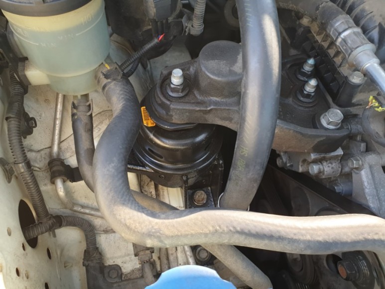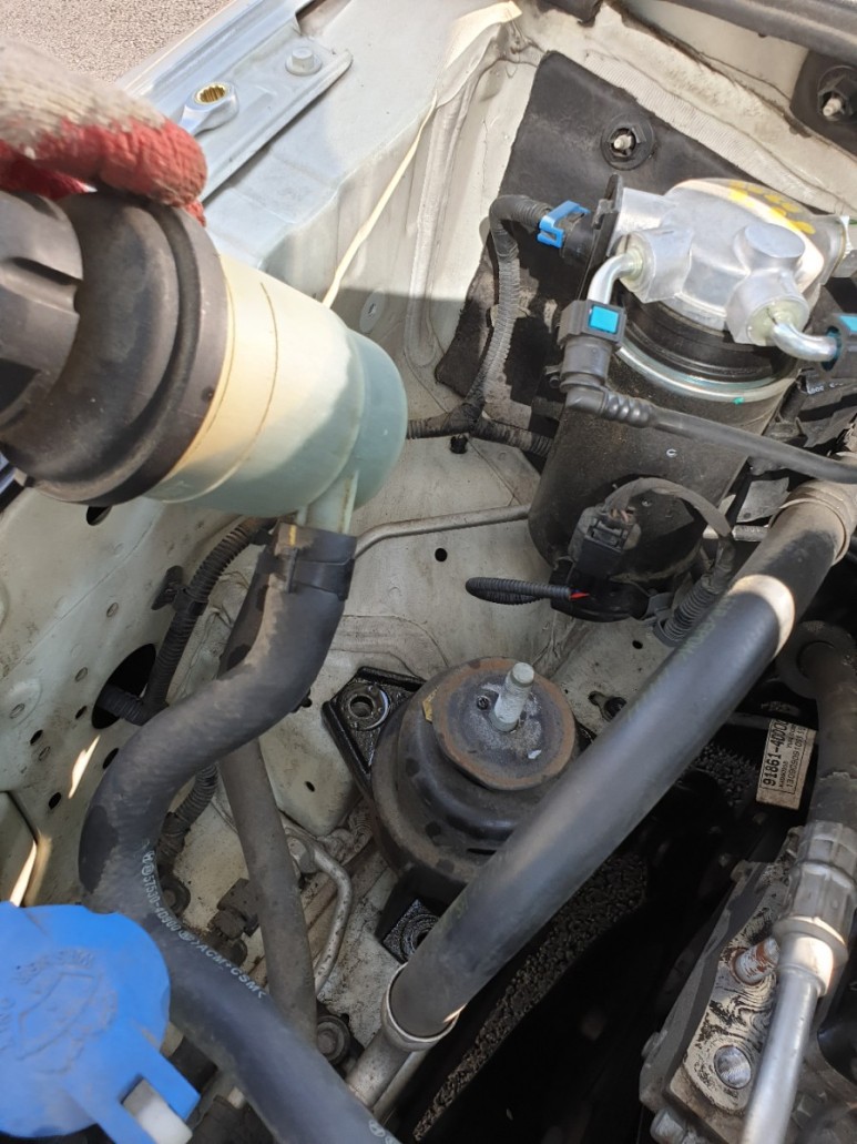 5. 음. 난관에 봉착. 파워 스티어링 호스가 미미 브라켓 볼트/너트 바로 위를 지나고 있어서 호스 위치를 옆으로 치우지 않으면 볼트와 너트 제거를 할 수 없다. 유니버설 소켓으로도 안된다. 우짜지? 한참을 이리저리 둘러봐도 방법은 하나.