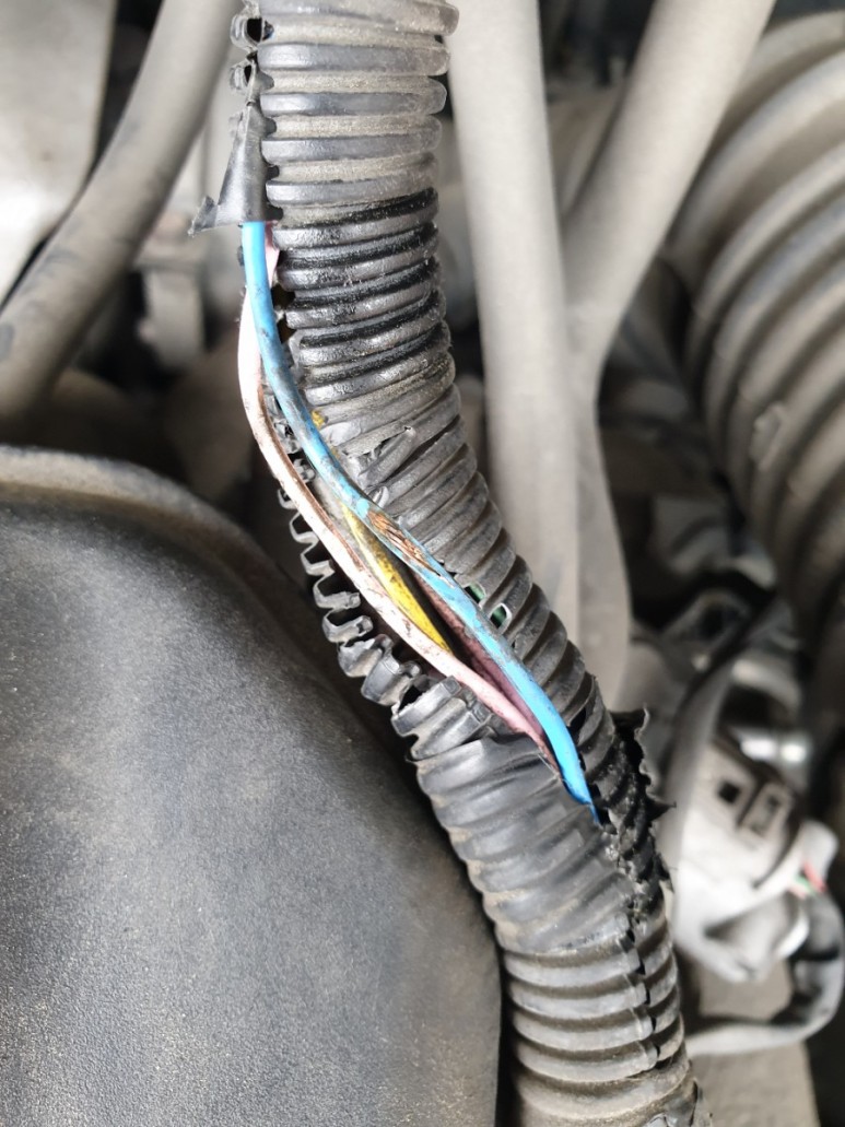 그랜드 카니발(2013년식) 엔진 룸 점검 중 배선 피복이 벗겨진 것을 발견했다. 배선 다발은 콜게이트 튜브로 보호되어 있는 형태지만 엔진 커버와 계속된 접촉 마찰로 인하여 배선 피복이 벗겨지고 내부 구리심이 노출되어 버렸다.