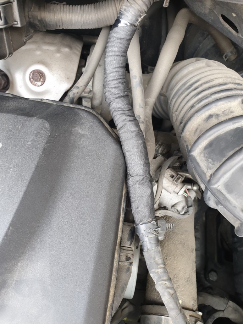 절연테이프로 잘 감아주고 마데인젊은이산 코로플라스트 고온용 배선 테이프로 여러 번 감아서 마감했다. 배선 레이아웃이 엔진 커버와 접촉될 수밖에 없게 되어 있다. 일종의 엔지니어링 미스로 보인다. 동일 차종의 해당 연식은 다 같을터이니 잘들 살펴보시오.
