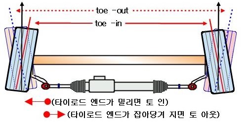 이대로 둘 수 없다. 포스팅한 정보대로 자가 조정 결정. 핸들이 좌측으로 약간 틀어졌기에 운전석 타이로드 길이를 조금 늘리고 조수석은 그만큼 줄이면 된다. (타이로드 길이를 늘리면 토우 인 상태가 되는 것이고 길이를 줄이면 토우 아웃 상태가 된다. 아래 그림 참고)