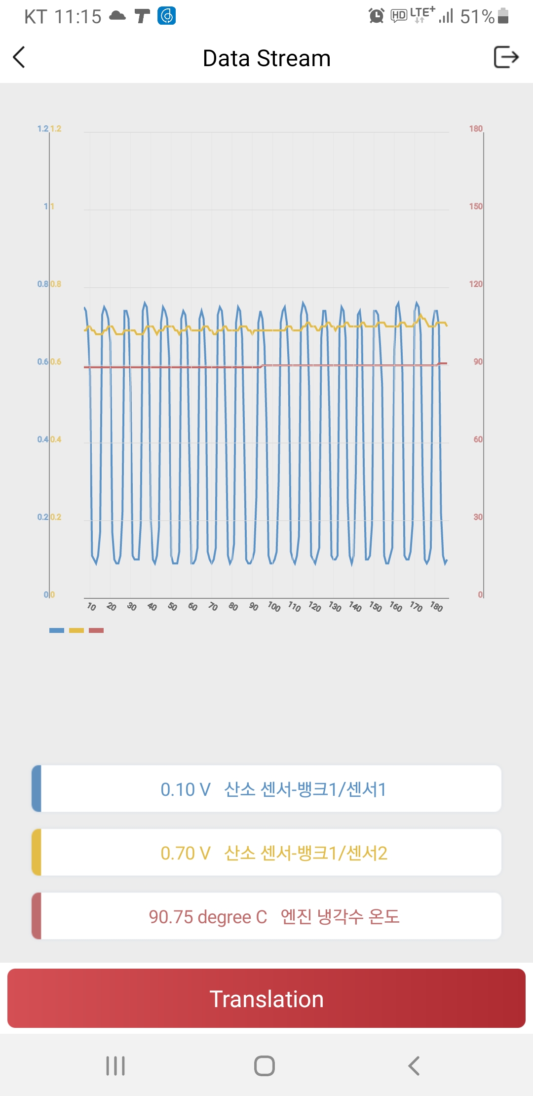Bank 1 Sensor 1(촉매 전단 센서)의 전압과 파형은 0.1 ~ 1.0V를 오르락내리락하면서 일정한 사인 파형을 나타내야 한다.